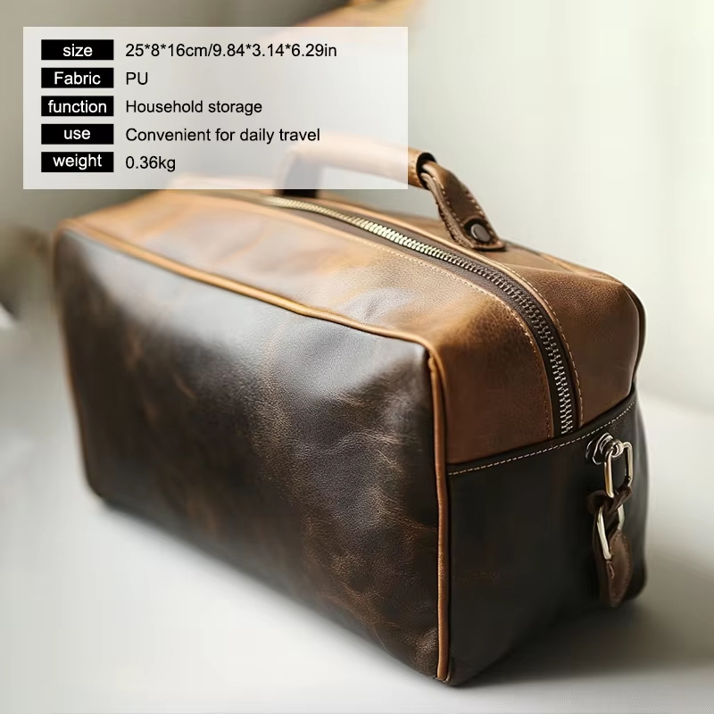 Made from high-quality canvas fabric, this men’s toiletry bag is built to withstand the rigors of daily use. The robust material ensures longevity, offering resistance to wear and tear. The PU (Polyurethane) leather accents enhance its overall aesthetic while providing additional protection, making it ideal for those who want a stylish yet reliable storage solution.