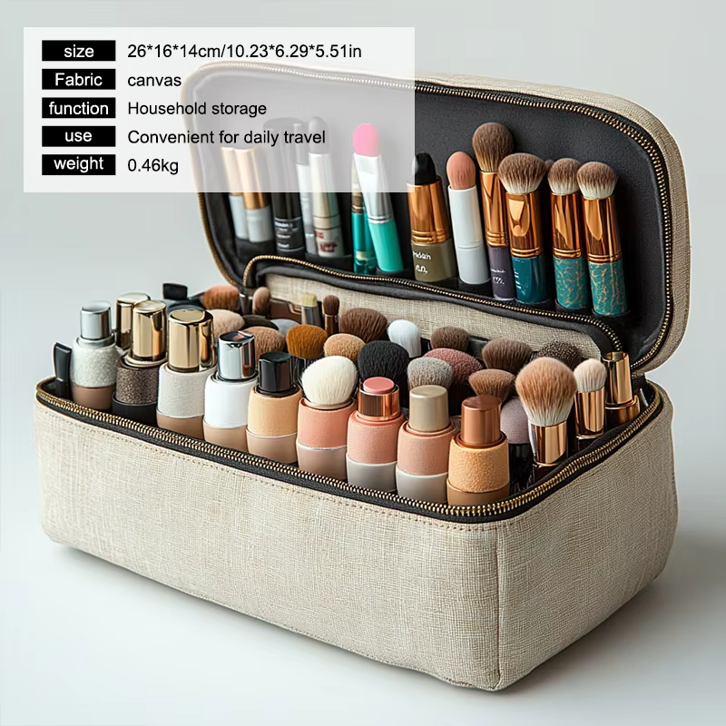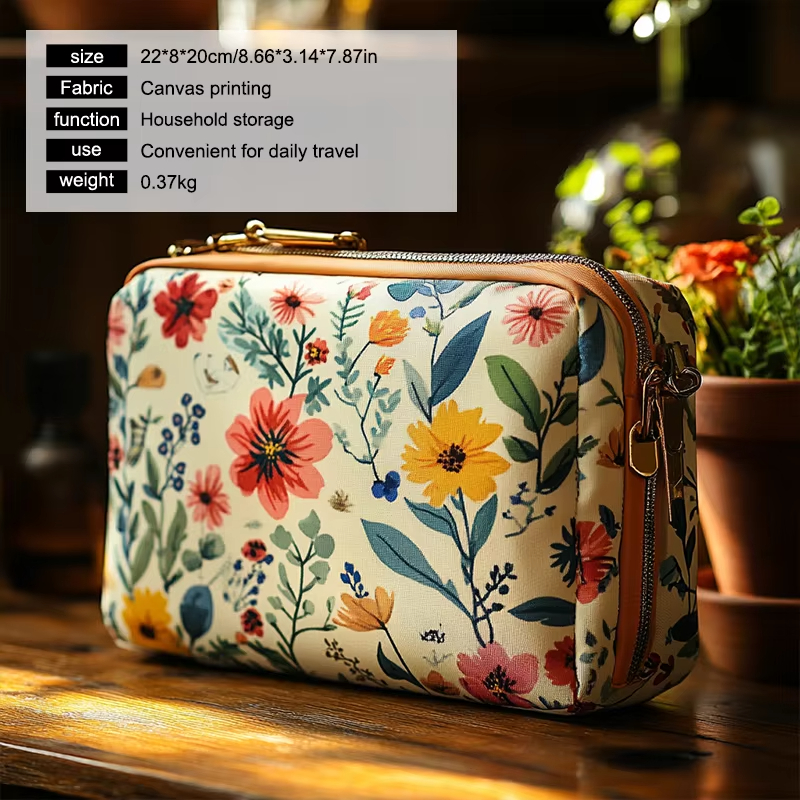 Not only does this printed canvas cosmetic bag make a great travel companion, but it also excels in household storage. Keep it in your bathroom, bedroom, or closet to store daily essentials like makeup, grooming tools, or even small accessories. Its spacious interior provides ample room for all your items, and the zippered closure ensures that nothing falls out or gets misplaced. The bag's simple yet elegant design makes it suitable for a wide range of uses and blends seamlessly with various home décor styles.