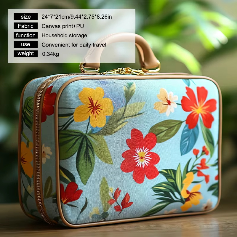 Made from high-quality Canvasprint + PU leather, this cosmetic bag offers the ideal blend of durability and style. The PU leather exterior provides a smooth, premium feel, while the printed canvas design adds a modern and fashionable touch. This combination ensures that the bag is not only practical but also a stylish accessory that will complement your travel essentials. The material is designed to withstand daily wear and tear, making it ideal for frequent travelers.
