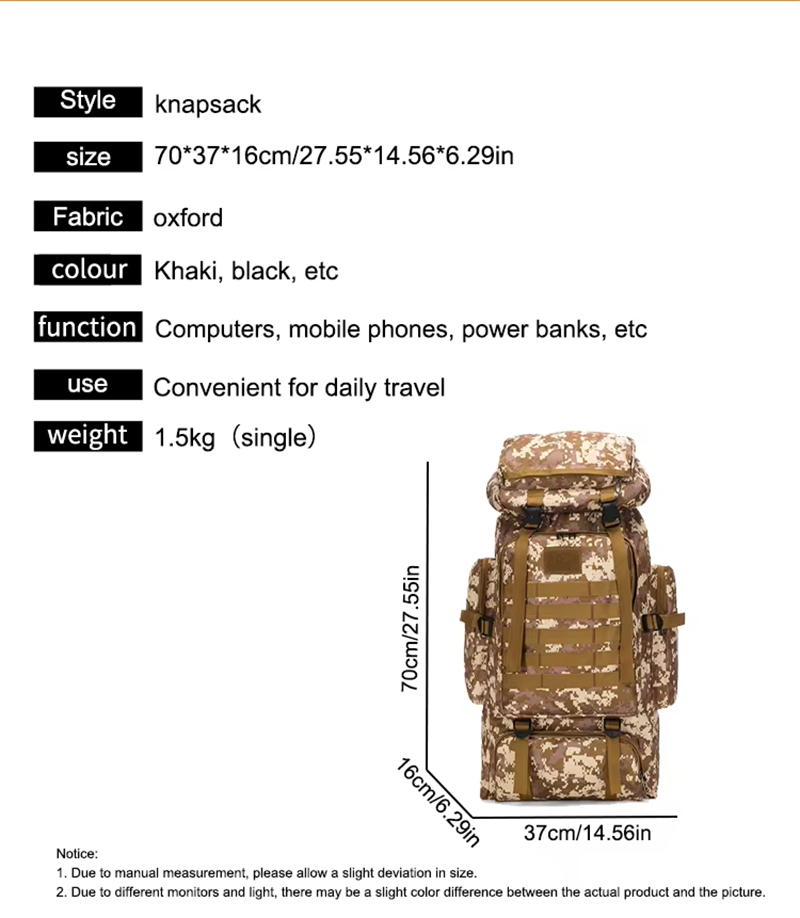 The versatility of this backpack makes it suitable for a wide range of outdoor activities. Whether you're into hiking, camping, fishing, or even travel, the Tactical Waterproof Foldable Outdoor Backpack adapts to your needs. Its ability to protect your gear from the elements and its thoughtful design make it an good companion for any outdoor adventure.